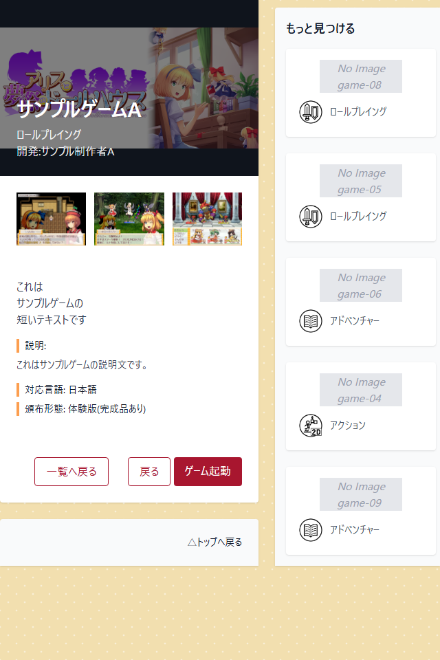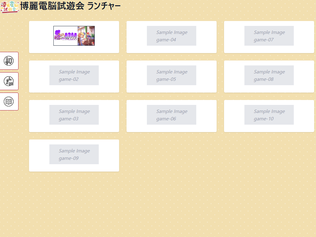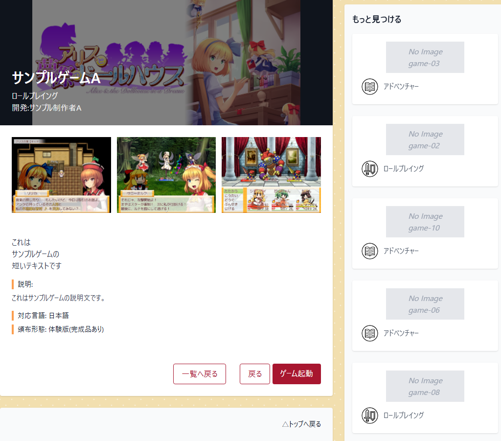 当企画では、イベント会場に訪れた人が 20 本以上の作品から遊ぶゲームを選択します。初心者でもスムーズに遊べるよう、独自のゲームランチャーを使っています。 参考画像(トップ) 参考画像(ゲーム詳細(横)) 参考画像(ゲーム詳細(縦))